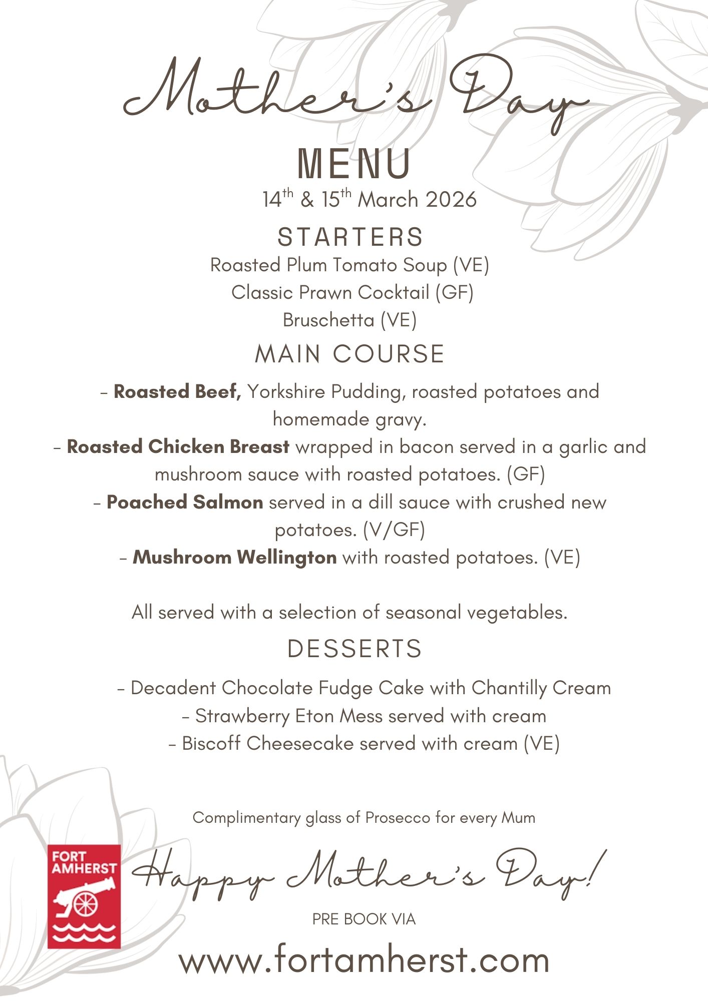Delight your Mum this Mother's Day weekend with either a scrumptious breakfast fit for a queen or a beautiful, delicious homemade three course menu, nestled in the historical grounds of Fort Amherst.